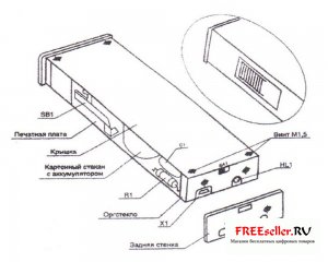 крышка и элемент крепления выключателя SA1, а также аккумуляторов. Аккумуляторы размещены по двое в картонных стаканах, склеенных по их размерам (по диаметру) и подпружиниваются к основной плате лепестками закрепленными на крышке.
