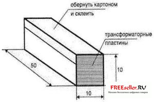 Высоковольтный трансформатор Т2 выполнен на пластинах из трансформаторного железа, набранных в пакет, рис. 4. Так как магнитное поле в катушке не замкнутое, конструкция позволяет исключить намагничивание сердечника. Намотка выполняется виток к витку (сначала наматывают вторичную обмотку) II - 1800...2000 витков проводом ПЭЛ диаметром 0,08...0,12 мм (в четыре слоя), I - 20 витков диаметром 0,35 мм. Межслойную изоляцию лучше выполнять из нескольких витков тонкой (0,1 мм) фторопластовой ленты, но подойдет также и конденсаторная бумага - ее можно достать из высоковольтных неполярных конденсаторов. После намотки обмоток трансформатор заливается эпоксидным клеем. В клей перед заливкой желательно добавить несколько капель конденсаторного масла (пластификатор) и хорошо перемешать. При этом в заливочной массе клея не должно быть пузырьков воздуха. А для удобства заливки потребуется изготовить картонный каркас (размерами 55x23x20 мм) по габаритам трансформатора, где и выполняется герметизация. Изготовленный таким образом трансформатор обеспечивает во вторичной обмотке амплитуду напряжения более 90000 В, но включать его без защитного разрядника F2 не рекомендуется, так как при таком напряжении возможен пробой внутри катушки.