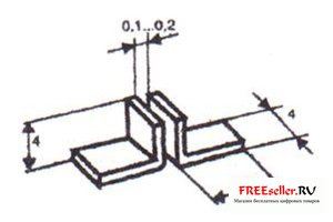 Защитный разрядник выполняется из двух оголенных проводов, расположенных на расстоянии 20...24 мм. Конструкция электродов Х2...Х3 и разрядника F2 показана на рис. 5. Элементы конструкции крепятся на боковых пластинах из оргстекла толщиной 5...6 мм. В качестве электродов Х2 и Х3 можно использовать стержни от разъемов на большой ток, например из серии ШР. Вид конструкции разрядника F1 приведен на рис. 6. В качестве материала лучше взять медные пластины с никелированным покрытием (этим обеспечивается более высокая стойкость разрядника к разрушению дугой). Толщина пластин может быть любой. Пробойное напряжение воздуха примерно 3 кВ на мм (зависит от влажности и атмосферного давления поэтому зазор разрядника F1 будет примерно 0,1...0,2 мм (регулируется при настройке).