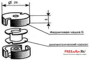 Рис.3. Составные части конструкции броневой катушки.В схеме использованы детали: резисторы МЛТ, конденсаторы С1 типа К73-17В на 400 В, С2 - К50-16 на 25 В. С3 - К10-17, С4 - МБМ на 750 В или типа К42У-2 на 630 В. Высоковольтный конденсатор (С4) применять других типов не рекомендуется, так как ему приходится работать в жестком режиме (разряд почти коротким замыканием), который долго выдерживают только эти серии.
