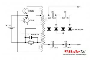 Трансформатор наматывается виток к витку на ферритовом стержне диаметром 8 мм, длиной 50 мм. Между каждым слоем прокладывается слой фторопласта.