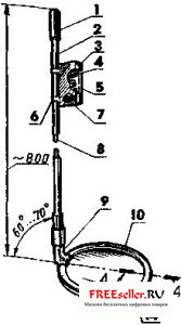 1 - ручка; 2 - несущая штанга (стеклопластиковая лыжная палка, L900- 1000); 3 - металлический кожух электронного блока; 4- гальваническая батарея «Крона»; 5 - печатная плата со смонтированными на ней радиодеталями; 6- скоба крепления кожуха (2 шт.); 7-регулятор «Настройка»; 8 - коаксиальный кабель; 9 - кронштейн; 10-поисковая катушка (0160 min, 60 витков ПЭЛ-0,2); 11 - изолирующая обмотка (изолента, слой); 12-электростатический экран (разреженная обвивка серпантином из алюминиевой фольги, концы разомкнуты); 13 - защитная обмотка (изолента, 2-3 слоя); 14- основание (круг из стеклотекстолита, s2-4)