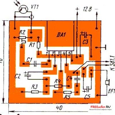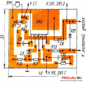 Приемный узел выполнен на микросхеме DA1, представляющей собой усилитель ЗЧ. Ко входу усилителя подключен фотоприемник на фототранзисторе VT1. Попадающий на него сигнал от лазерной указки абонента усиливается и поступает на телефонный капсюль BF1, размещенный в телефонной трубке. Рис. 3 Лазерный светотелефон. Печатная плата передатчика.