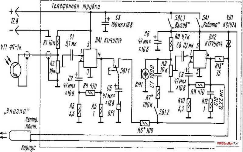В капсюле раздается сигнал вызова, свидетельствующий о подаче его и на указку. Громкость сигнала устанавливают подбором резистора R6.