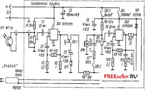 Отпустив кнопку, направляют фототранзистор на включенную осветительную лампу. В капсюле должен прослушиваться фон переменного тока. После этого устанавливают цепочку C7 R7 и подбором ее деталей получают требуемую тональность вызывного сигнала. Подключают указку и контролируют напряжение на ней. Подбором резистора R13 добиваются, чтобы напряжение было равно 4 В.
