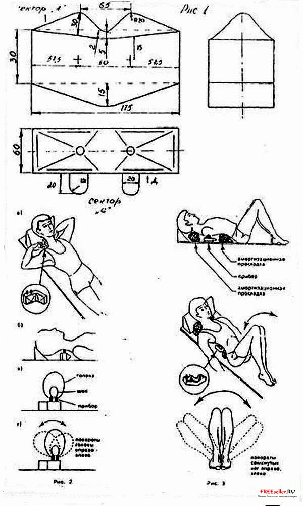 Больной в легкой одежде или без нее занимает исходное положение лежа спиной на коврике на полу с приподнятым изголовьем (рис 2а). Устройство устанавливается поперечно выступами сектора "С" под верхнюю часть шейного отдела позвоночника и удерживается так, чтобы позвоночник находился между выступами (рис. 26, 2в).