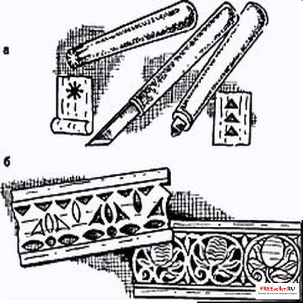 Рис.4. Резьба по бересте: а - инструменты (штампик, косяк, пробойник); б - образцы прорезной резьбы.