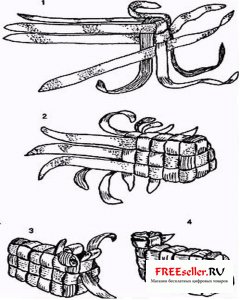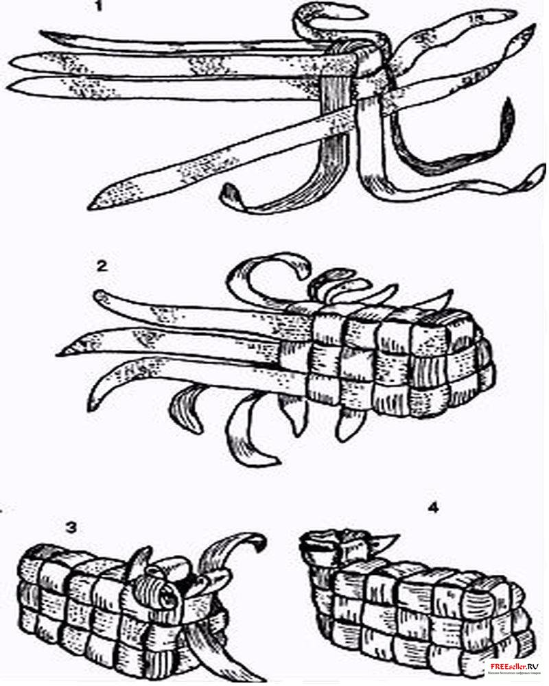 Плетение наружного слоя начинают с осевой и длинной лент. Затем вплетают продольные (сверху вниз) и, наконец, поперечные (от горловины к хвосту) ленты.