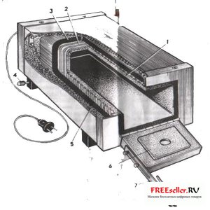 Рис.1. Электрическая муфельная печь: 1 - муфель, 2 - обмотка, 3 - обмазка, 4 - клемы заземления, 5 - асбестовая крышка, 6 - керамический элемент, 7 - задвижка дверцы