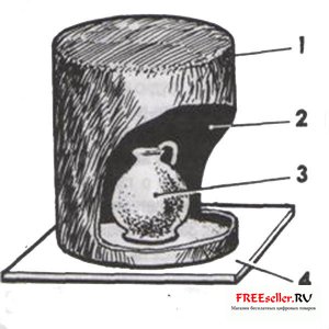 Рис.3. Капсула для глазурования: 1- асбестово-глиняная обмазка толщиной 5 мм, 2 - корпус из консервной банки, 3 - изделие, 4 - керамическая плитка