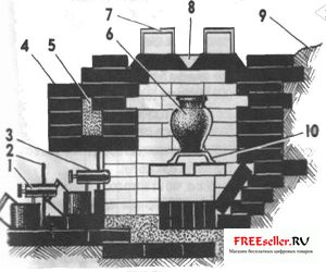 Рис.2. Горн (в разрезе): 1- паяльная лампа в положении прогрева, 2 - асбестовый экран, 3 - лампа в положении обжига, 4 - кирпичная кладка, 5 - уплотненный песок, 6 - изделие, 7 - керамическая крышка с ручками, 8 - отверстие в крышке для наблюдения, 9 - грунт, 10 - керамическая подставка