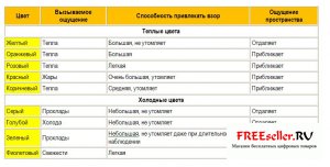 Цвета воспринимаются как "теплые" или как "холодные". Зрительно они могут приближать окрашенный предмет или отдалять его. Восприятие разных цветов приведено в таблице.