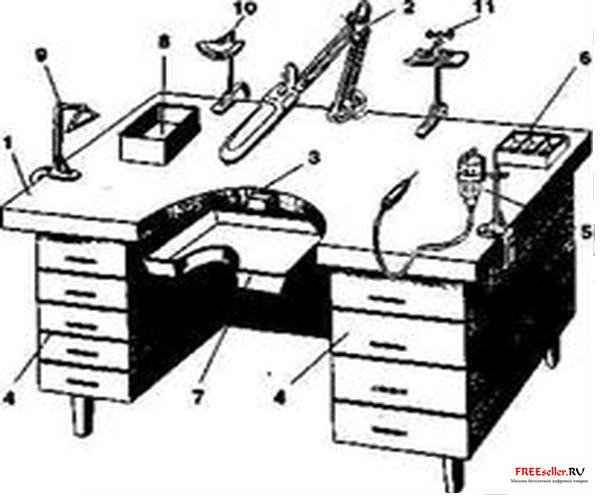 Рис. 1 .Рабочий стол-верстак: 1 - столешница; 2 - настольная лампа; 3 - финагель; 4 - ящики для инструмента; 5 - бормашина; 6 - ванночки; 7 - поддон для отходов; 8 - гофта; 9, 10, 11 - приспособления-держатели