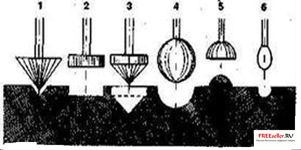 Рис. 3. Фрезы: 1 - коническая; 2 - цилиндрическая торцевая; 3 - комбинированная остроконечно-цилиндрическая; 4- шаровая; 5- плоская сферическая; 6 - фасонная