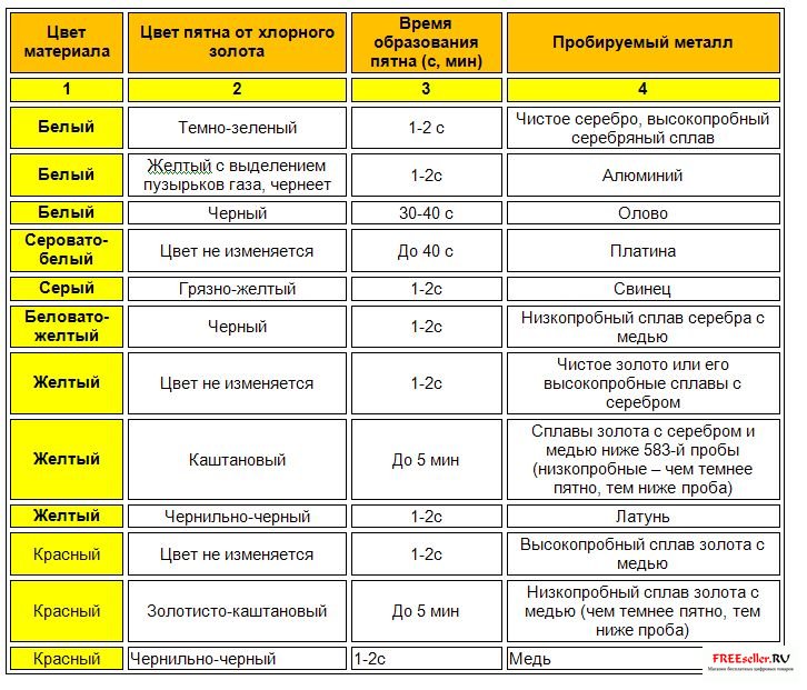 Самым точным является муфельный метод пробирования, или горячий анализ, но его можно произвести только в химической лаборатории, которая располагает муфельными и тигельными печами. Итак, о наиболее доступных способах пробирования драгоценных металлов в частной мастерской. Капельный метод осуществляется с помощью раствора хлорного золота и пробирных реактивов. Хлорное золото получают воздействием хлора или “царской водки” на золотой металл. Образовавшийся при этом темно-коричневый раствор выпаривают, а осадок растворяют в воде. На зачищенную надфилем поверхность пробируемого металла, сплава, лома опускают каплю раствора хлорного золота, на смоченном месте сразу появляется пятно от выделившегося осадка золота. Цвет его от примеси образовавшегося раствора хлорной соли пробируемого материала принимает различные оттенки, по которым в соответствии с установленными данными (приведены в табл. 1) определяют пробу сплавов драгоценных металлов.