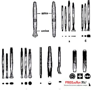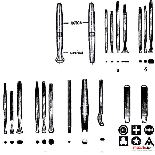 Рис.1. Инструменты для чеканки: Чеканы: а - расходники; б - лощатники; в - бабошники; г - пурошники; д - трубочка; е - канфарник; ж - сапожок; з - фигурные
