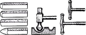 При выколотке крупных глубоких рельефов удобнее применять деревянные чеканы. Они незаменимы при выравнивании фонов. Деревянные чеканы изготовляют из твердых пород дерева - граба, бука или дуба. Деревянные чеканы представляют собой четырехгранные брусочки с обработанной рабочей частью, по форме близкой к форме металлических чеканов - лощатнику, пурошнику, бабошнику. Их размеры значительно больше, чем металлических. Боевую часть деревянного чекана тщательно выравнивают напильником с мелкой насечкой, а затем шлифуют наждачной бумагой. Поверхность граней чекана зачищают и покрывают лаком.