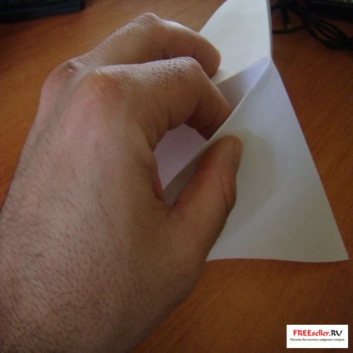 3) Надавив на середину салфетки, вогните боковые треугольники, складывая их пополам. При этом верхняя часть салфетки согнется на другую сторону.