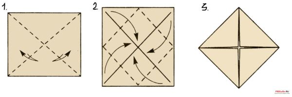 1) Лист бумаги квадратной формы (например, салфетка) перегибается по обоим диагоналям. В результате намечаем центр листа бумаги.