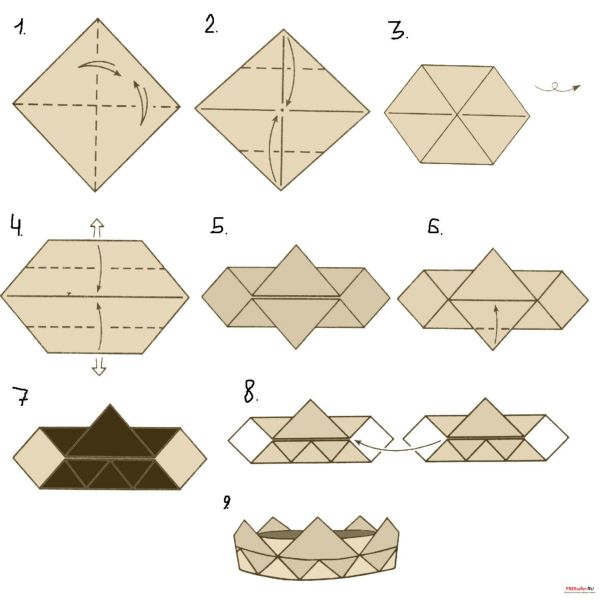 Для того чтобы сделать оригами: низкую корону, необходимо выполнить следующие действия: