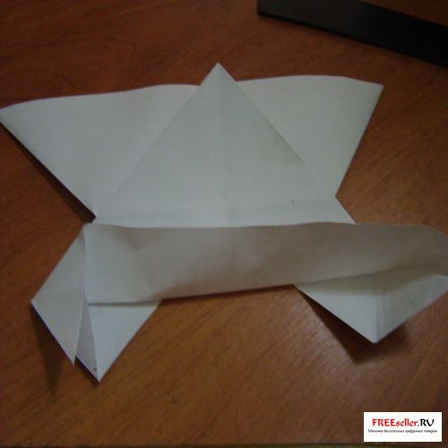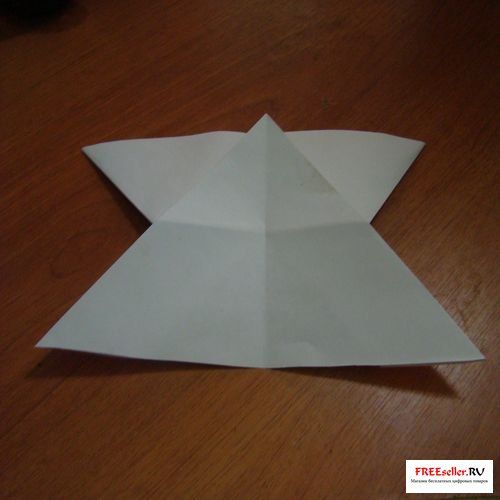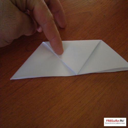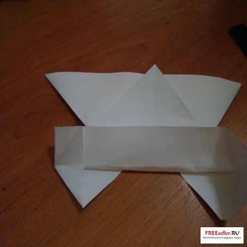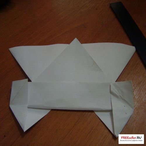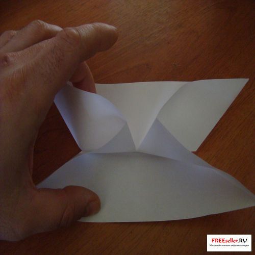 4) Перегните, поднимаю нижнюю сторону к линии сгиба, как показано на рисунке или на схеме. А поднимая нижнюю сторону раскройте и выверните боковые углы.