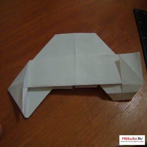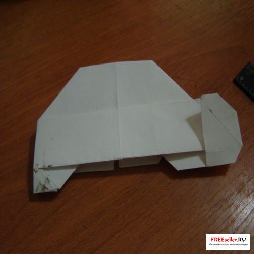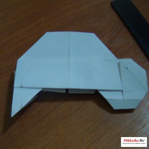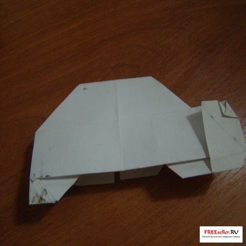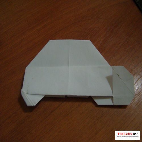 6) Вгибаем глухой угол. На передних уголках передних колес нужно вогнуть уголки и сделать складки молнии. Задние колеса согнуть с обеих сторон от себя и заправить внутрь.