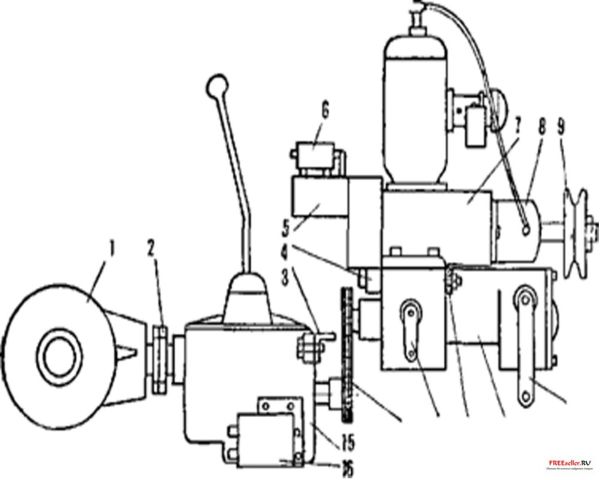 1 - задний мост; 2 - фланцы КПП и заднего моста; 3 - кронштейн крепления КПП; 4 - кронштейн крепления редуктора; 5 - стартер; 6 - электромагнитный включатель стартера; 7- двигатель ПД-10А; 8 - магнето; 9 - шкив привода вентилятора; 10 - рычаг сцепления; 11 - понижающий редуктор; 12 - правый кронштейн крепления редуктора; 13 - рычаг включения пониженной передачи; 14 - цепь; 15 - КПП; 16 - маслонасос ГАЗ-93.