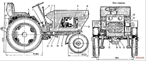 Вся конструкция микро трактора (рис. 1 и рис.2) разрабатывалась под двигатель ПД-10А в комплекте с редуктором и муфтой включения от списанного трактора ДТ-54А. Использование дополнительно коробки передач от автомобиля ГАЗ-51 позволило получить восемь передних и две задние скорости.