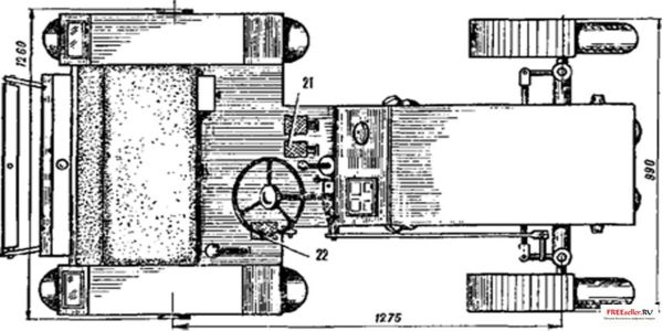 1 - основание системы гидронавески; 2 - указатель поворотов и стоп-сигнал; 3 - бензобак; 4 - рычаг управления муфтой сцепления; 5 - педаль тормоза; 6 - рычаг переключения передач; 7 - щиток приборов; 8 - рулевая сошка; 9 - приводной ремень вентилятора; 10 - указатель поворота; 11 - инструментальный ящик; 12 - задний мост; 13 - коробка перемены передач; 14 - редуктор; 15 - маслонасос ГАЭ-93; 16 - генератор ДТ-54А; 17 - понижающий редуктор; 18 - продольная рулевая тяга; 19 - двигатель ПД-10А; 20 - тяга переключения передач; 21 - педаль понижающего редуктора; 22 - педаль маслонасоса.