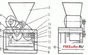 I - станина, 2 - фреза, 3 - бункер, 4 - двигатель, 5 - ведущий валок, 6 - скребок, 7 - подвеска, 8 - сливной кран, 9 - резервуар, 10 - сито, 11 - пружина, 12 - скребок, 13 - поводок скребка, 14 - пружина ведомого валка, 15 - скользящая букса валка, 16 - емкость накопитель отжатой массы.
