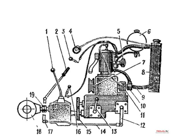 1 - рычаг переключения передач, 2 - рычаг управления муфтой сцепления, 3 - рычаг обогатителя карбюратора, 4 - указатель температуры воды, 5 - воздухофильтр, 6 - бензобак, 7 - маховик коленчатого вала, 8 - радиатор, 9 - нижний водяной патрубок, 10 - водяная помпа, II - магнето, 12 - рычаг муфты сцепления, 13 - рычаг включения редуктора, 14 - тяга привода муфты сцепления, 15 - ведомое зубчатое колесо, 16 - рычаг «газа», 17 - промежуточный рычаг муфты, 18 - задний мост, 19 - соединительная муфта.