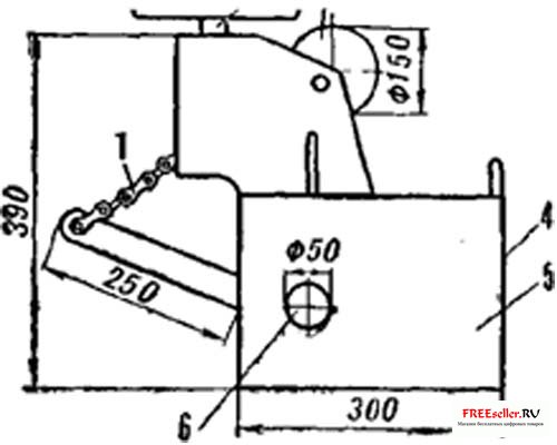 Держит вал специально изготовленная рама, прикрепленная к раме трактора. Над ней смонтировано подъемное приспособление, взятое из штурвала подъемника плуга и уменьшенное до нужных размеров (рис. 3].