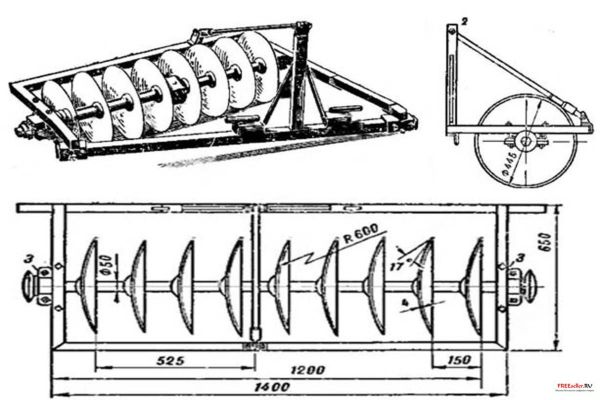 За основу дисковой бороны они взята батарея из восьми сферических дисков 0 445 мм, расстояние между ними - 150 мм.