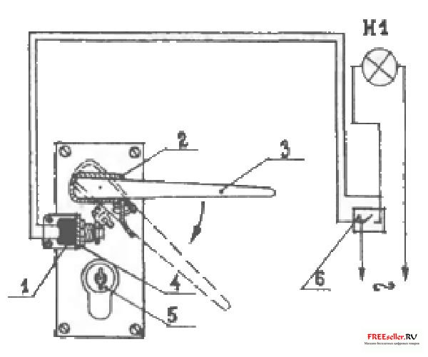 1 — кнопочный выключатель, 2 — скоба, 3 — ручка, 4 — уголок для крепления кнопки, 5 — дверной замок, 6 — комнатный выкючатель.