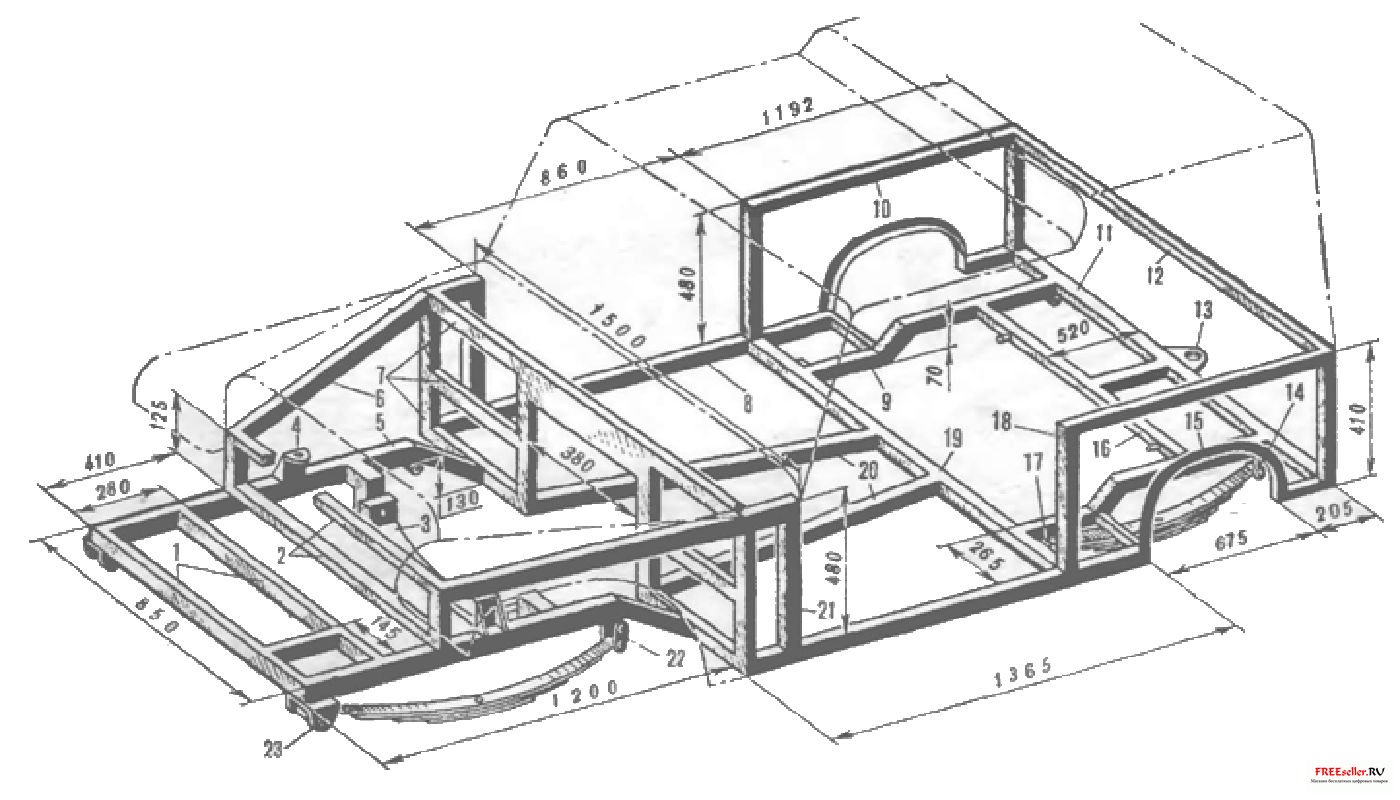 1 - передняя балка (50Х 25 мм), 2 - элементы моторного отсека (50Х 25 мм), 3 - ложемент крепления двигатели, 4 - кронштейн амортизатора, 5 - передний лонжерон (50X50 мм), 6 - балка капота (40X40 мм), 7 - элементы задней стенки моторного отсека (50X25 мм), 8 - порог (50Х 25 мм), 9 - задний лонжерон (40X40 мм), 10 - борт (25X20 мм), 11 - задняя поперечина (40X40 мм), 12 - подоконная перекладина (25 X 20 мм), 13 - прицепной кронштейн, 14 - серьга -задней рессоры, 15 - арка заднего колеса (уголок 25X25 мм), 16 - промежуточная поперечина (40x40 мм) с пальцами креплении амортизатора к кузову, 17 - кронштейн задней рессоры, 18, 21 - дверные стойки (40X40 мм), 19 - передний поперечина (40x40 мм), 20 - подкосы (50X25 мм), 22 - серьга передней рессоры 23 - кронштейн п 'редн й рессоры.