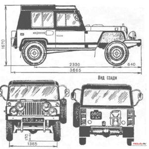 Внешне «джип» выглядит меньше, чем, скажем, ЛуАЗ, хотя по размерам салона и багажника ему не уступает. Это достигнуто, во-первых, плотной «упаковкой» двигательного отсека и, во-вторых, наружным размещением части багажа (на крыше), запасного колеса (слева по борту) и канистры (сзади). Полный вес - 900 кг.