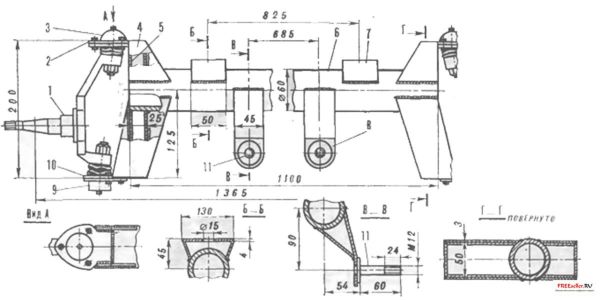 Основной его элемент - толстостенная бесшовная стальная труба 060 и длиной 1100 мм. К ней приварены подрессорные подушки, пальцы крепления амортизаторов и опорные площадки шаровых подшипников передней подвески.