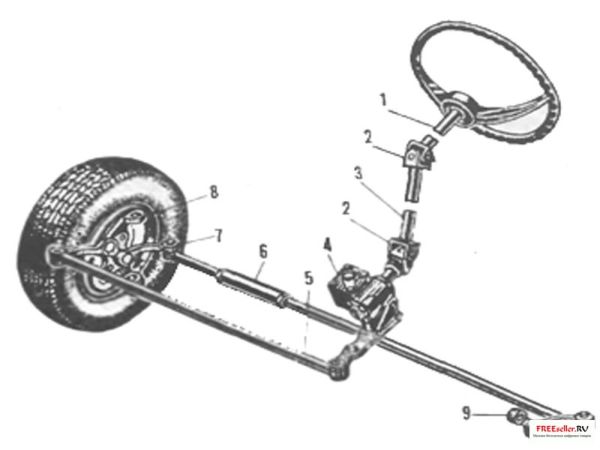 I - рулевой вал, 2 - карданные шарниры, 3 - промежуточный вал, 4 - рулевой механизм, 5 - нерегулируемая тяга, 6 - регулируемая тяга, 7 - сдвоенный рычаг правого колеса, 8 - поворотная цапфа, 9 - одинарный рычаг левого колеса.