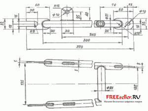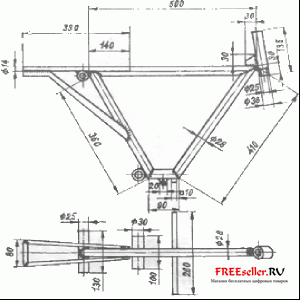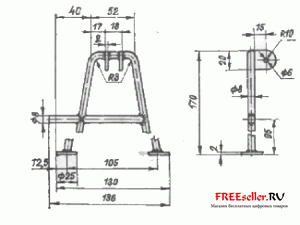 Ну а теперь о конструкции машины. Конфигурацию рамы (рис. 2) предопределило использование двигателя Д-6. Трубы для нее диамтером 28 мм и 14 мм позаимствованы от старой велосипедной рамы. Задняя маятниковая подвеска сварена из труб диаметром 21 мм. Передняя вилка от мопеда «Рига». Пришлось только ее укоротить: подрезать перья и штоки на 130 мм, а на перья снизу приварить скобы (рис. 5). Переднее колесо взято от детского самоката без переделок, к нему приспособлен редуктор спидометра. Руль от мотоцикла «Ява». На нем располагаются сектор газа, рычаг сцепления, штатный рычаг барабанного тормоза заднего колеса, выключатели фары и звукового сигнала.