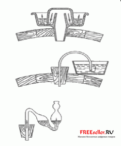 На практике обычно приходится иметь дело со стеклянной трубкой, согнутой дугой. Однако встречаются и более сложные конструкции шпунтов. Трубка может быть изогнута S-образно (система Несслера), и тогда слой изолирующей жидкости заключается внутри ее самой. Если домашнее ягодное виноделие ведется в более или менее обширных размерах с применением деревянных бочонков или бочек, выгодно использовать бродильный шпунт-воронку. Все эти системы изображены на рис. 3.