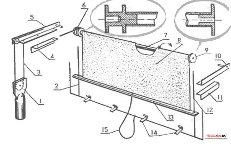 Механизм подъема тента устроен таким образом, что пленка поднимается (наматывается на трубу) под действием грузика, висящего на подвижном блоке, а для того, чтобы опустить тент, достаточно потянуть вниз привязанный к нижнему канту шнур и заложить кант за захваты-крючки. Чтобы обеспечить беспре-пятственный подъем или опускание тента (особенно во время ветра), через отверстия в концах жесткого канта пропущены две вертикально натянутые лески - направляющие.