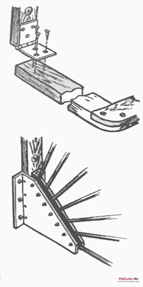При строительстве каркаса отдельные рамы набирают из деревянных реек сечением 2,5X70 мм Если машина или судно довольно длинные, то подбирают рейки несколько большего течения, чтобы они не прогибались. Рейки рамы соединяют под углом болтами (желательно из латуни). Затем укрепляют на обращенных внутрь концах рам шарниры, как показано на рисунке 2.