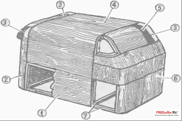 1 - боковая панель (фанера или доски); 2 - углы (прямые) из фанеры, 3 - углы двоякой кривизны из гипса; 4 - крышевая панель (фанера с загибом на борта), 5 - панель скошенной части кузова (фанера с загибом на крышу), 6 - торцевая панель (фанера с загибом на борта), 7 - бруски каркаса.