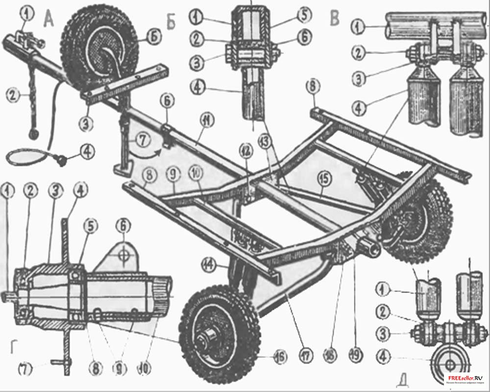 1 - замок сцепного устройства под шар 050 мм, 2 - страховочная цепь, 3 - передняя опора днища кузова, 4 - разъем электросистемы, 5 - запасное колесо на кронштейне, 6 - скоба крепления опоры в походном положении, 7 - опора дышла в стояночном положении, 8 - боковая опора днища кузова, 9 - поперечный коробчатый лонжерон рамы, 10 - траверса крепления амортизаторов, 11 - дышло, 12 - болт сайлентблока подвески переднего качающегося рычага, 13 - щека передних сайлентблоков, 14 - амортизатор подвески. 15 - передний качающийся рычаг, 16 - колесо (шина 5Х10), 17 - качающийся рычаг полуоси, 18 - болт сайлентблока, 19 - щека задних сайлентблоков.