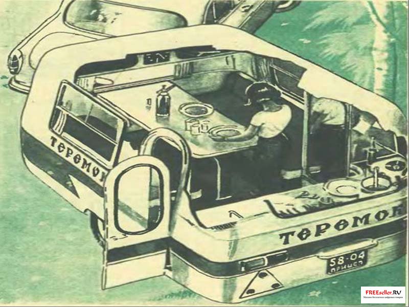 Дверь - двойная: наружный слой - фанера толщиной 10 мм, внутренний 3 мм, между ними - слой пенопласта толщиной 30 мм. Навесы врезаны в бруски коробки. Внутренняя поверхность кузова оклеена пенопластом марки ПХВ-1 толщиной 16 мм, лицевой внутренний слой стен покрыт линкрустом, потолок - плотной бумагой, пол - линолеумом. Стены кухонного отсека оклеены синтетической плиткой. Электропроводка - скрытая в толще пенопласта. Прямо импортный вариант! Даже лучше.