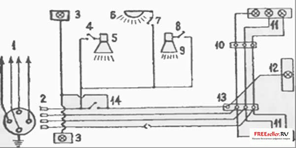1 - провода к электросистеме автомобиля, 2 - разъем четырехконтактный, 3 - габаритные огни передние, 4 - выключатель кухонной лампы, 5 - кухонная лампа, 6 - потолочный плафон, 7 - выключатель плафона, 8 - выключатель настольной лампы, 9 - настольная лампа, 10, 13 - соединительные колодки, 11 -задние фонари (габарит, указатель поворотов, стоп-сигнал), 12 - фонарь освещения номерного знака, 14 - общий выключатель внутренних потребителей тока; схема предусматривает общую массу.