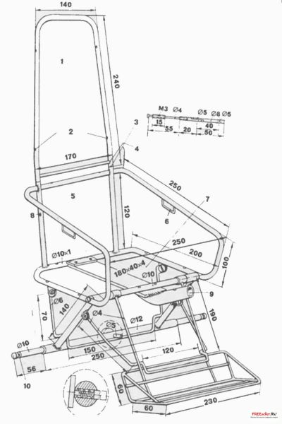 1 - мягкая обшивка, 2 - крепление обшивки, 3 - сочленение спинки сиденья, 4 - металлический прут, 5 - крепление обшивки, 6 - скоба для удерживающего ремня, 7 - обшивка (подушка) сиденья, 8 - винт фиксации сочленения, 9 - гнездо для дышловой трубы (ее длина 900 мм), 10 - чека для крепления колеса.