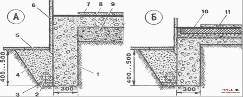 Рис. 4. Конструкция фундамента (А - с холодным полом, Б - с утеплением):