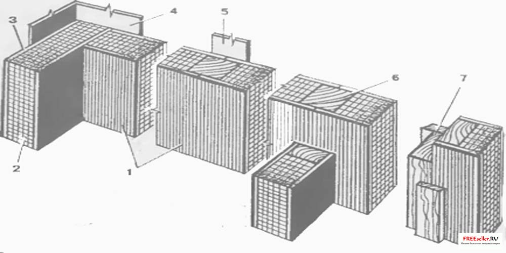 1 - лист внутренней облицовки, 2 - слой теплоизоляции, 3 - наружная обшивка, 4, 5 - заделка углов и стыков обшивки. 6 - несущий брус панели, 7 - заделка дверной или оконной коробки.