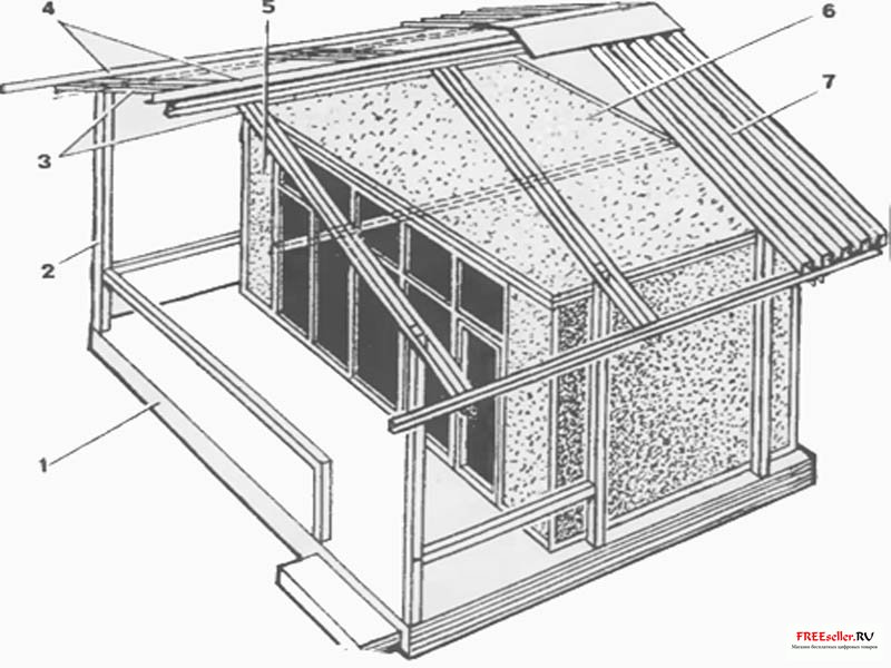 1 - фундамент-основание. 2 - колонка несущего каркаса, 3 - каркас крыши, 4 - продольные профили крыши, 5- стеновая панель, 6 - панель потолка, 7 скатные ребра кровли.